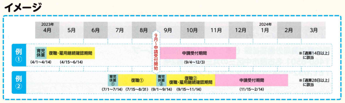 ・対象従業員が育児休業から原職等に復帰後2か月経過した日 (起算日) の翌日から3か月以内、又は2024年 3月31日のいずれか早い日まで